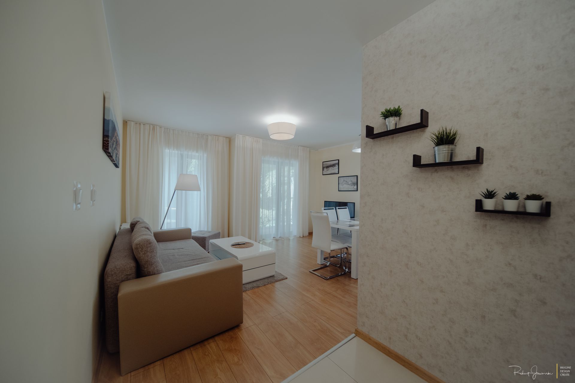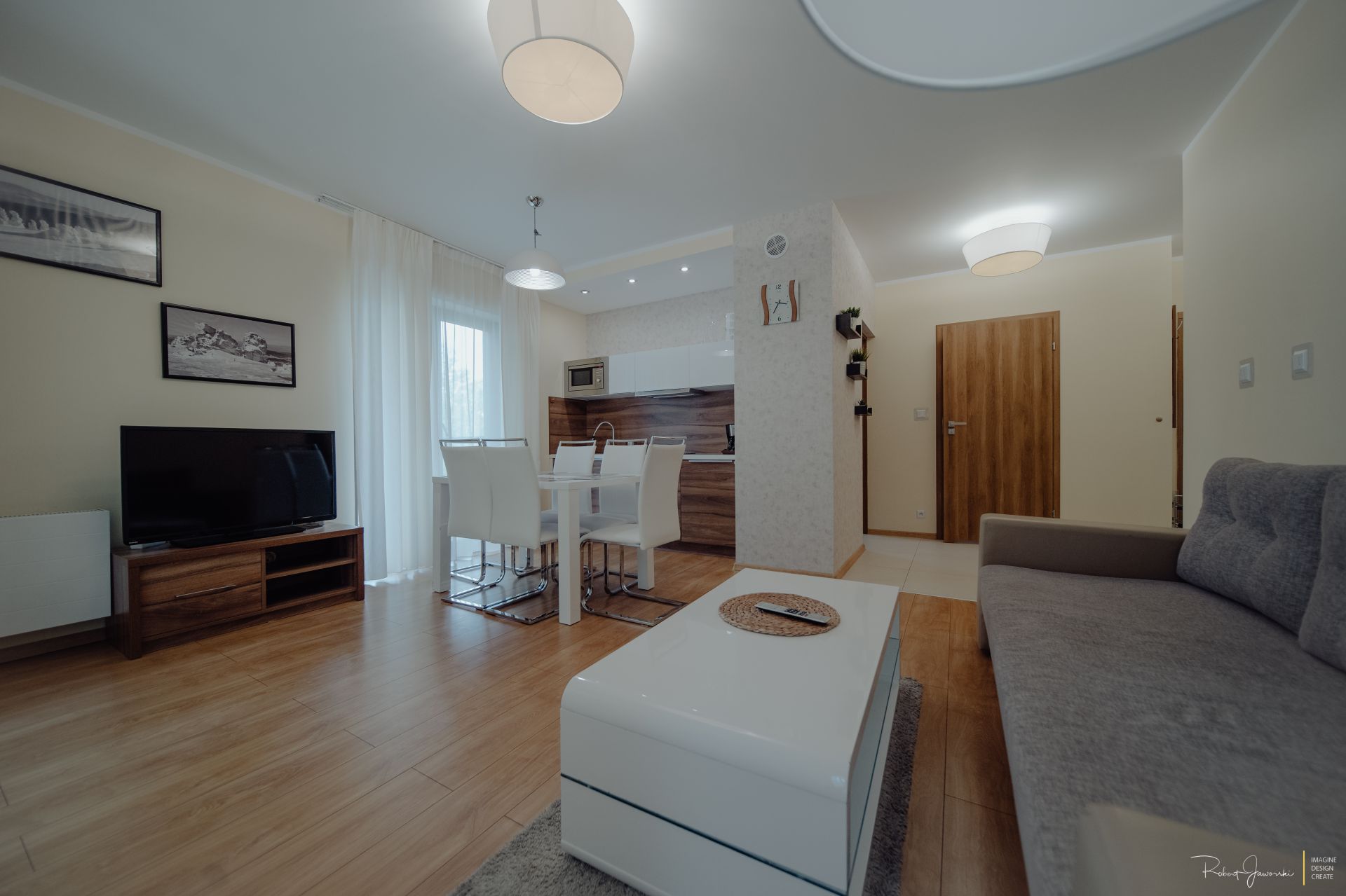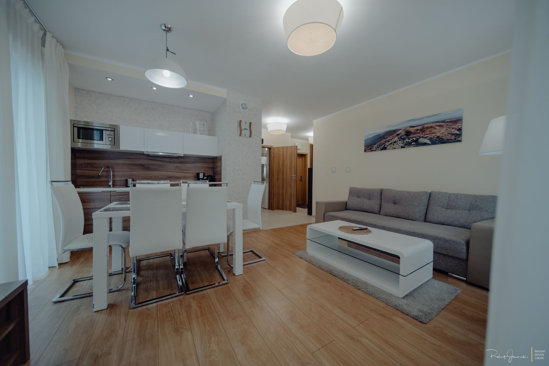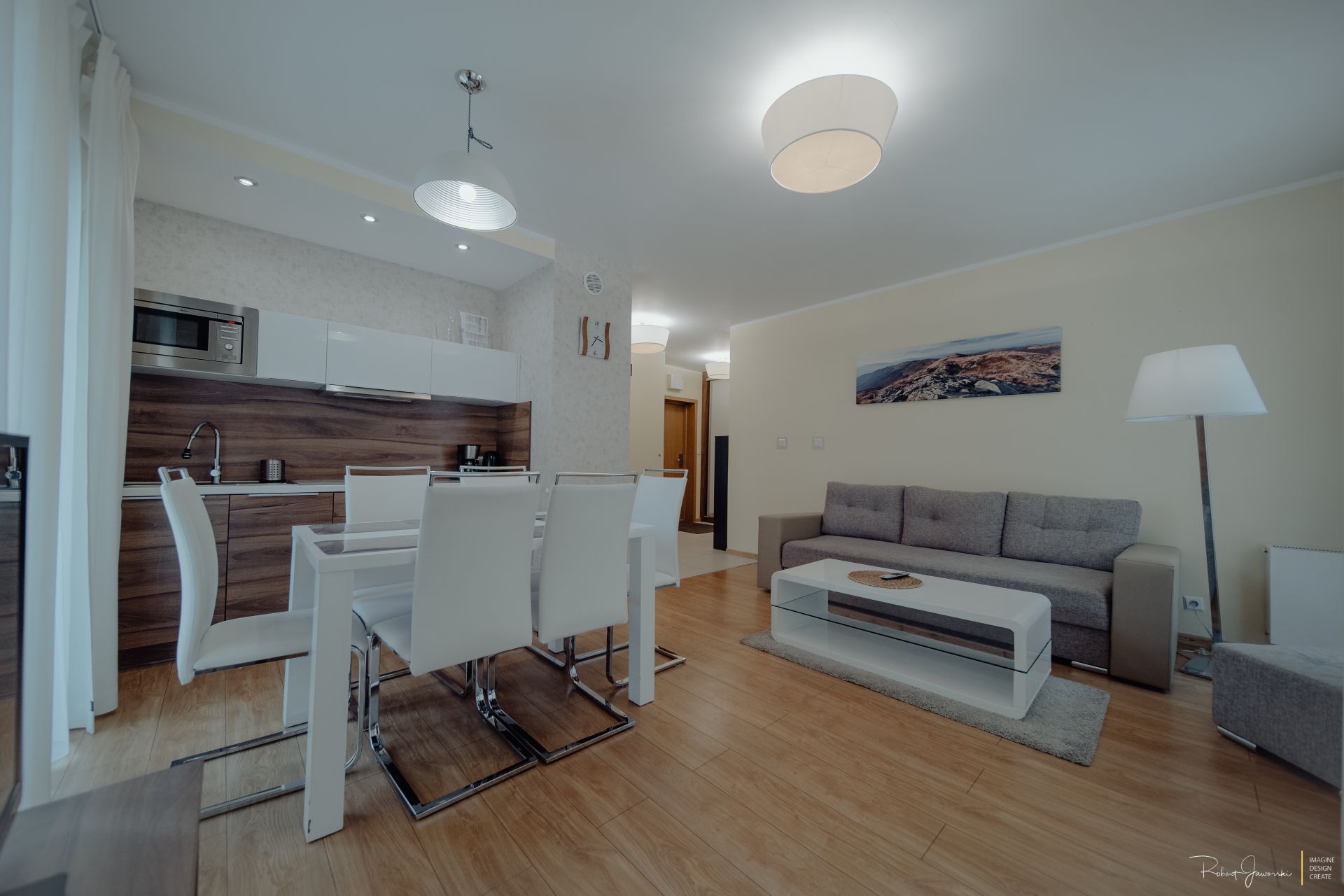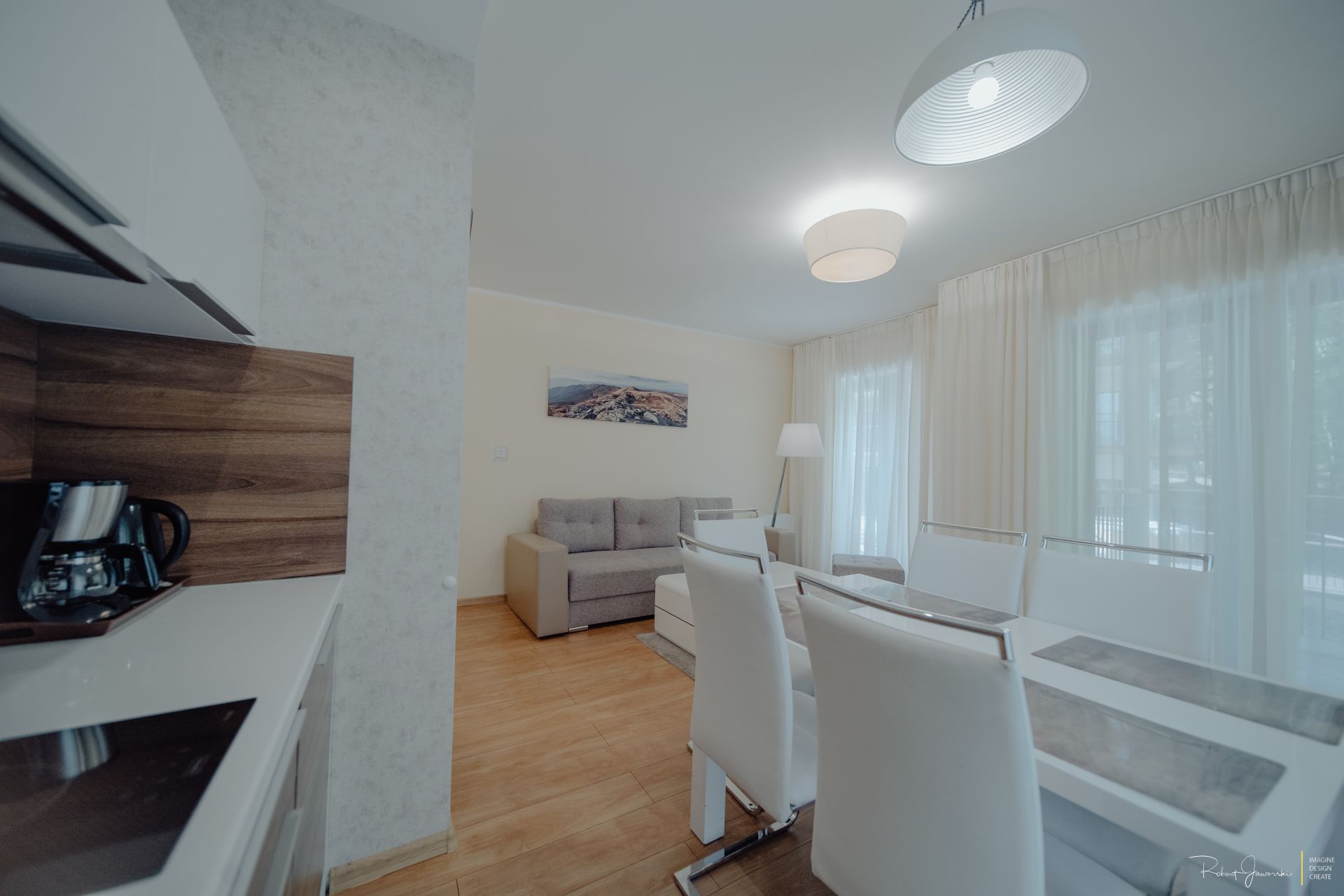 Aneks kuchenny wyposażony : płyta indukcyjna, piekarnik, zmywarka, lodówka, czajnik elektryczny, naczynia, garnki, sztućce .