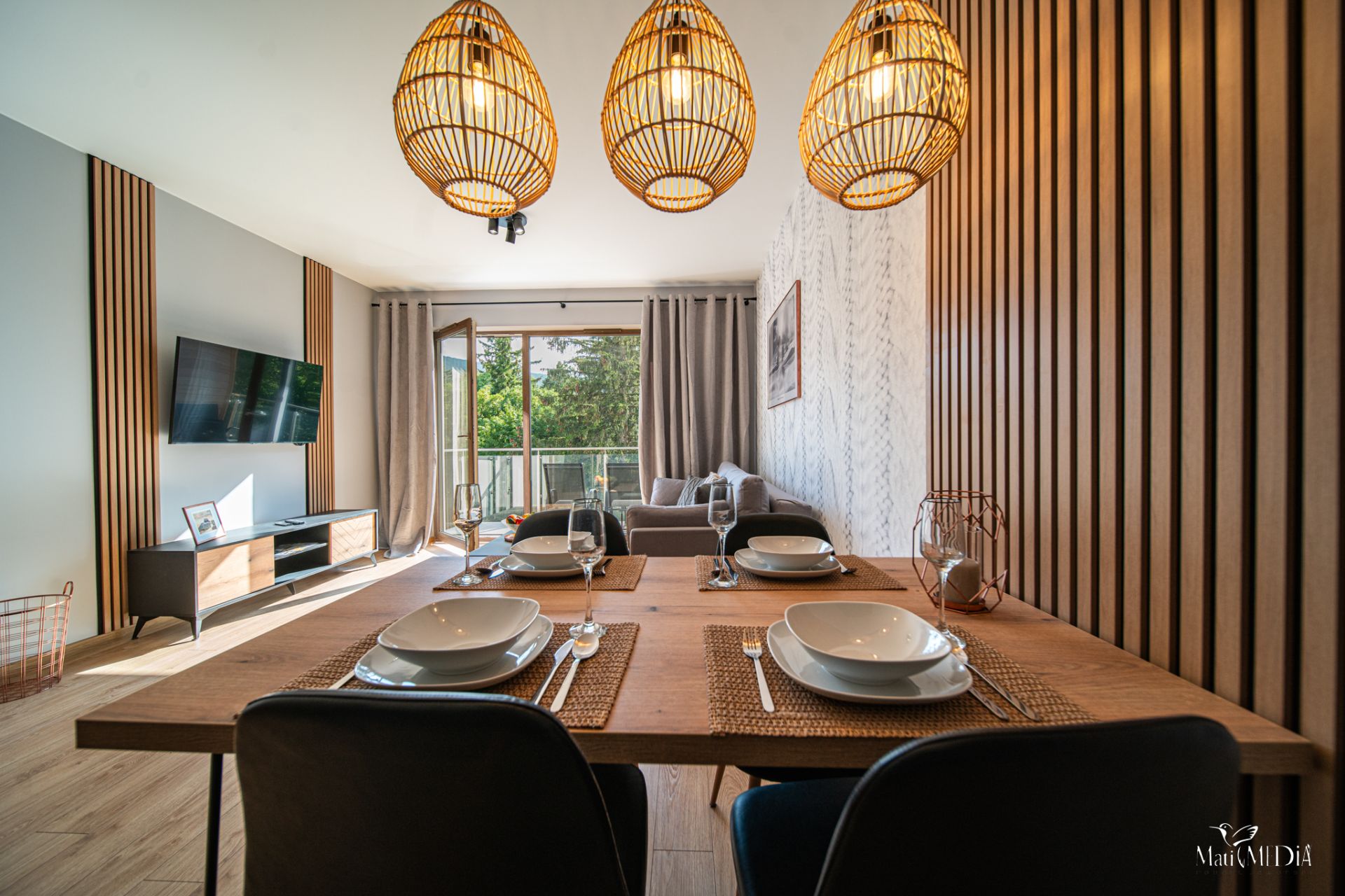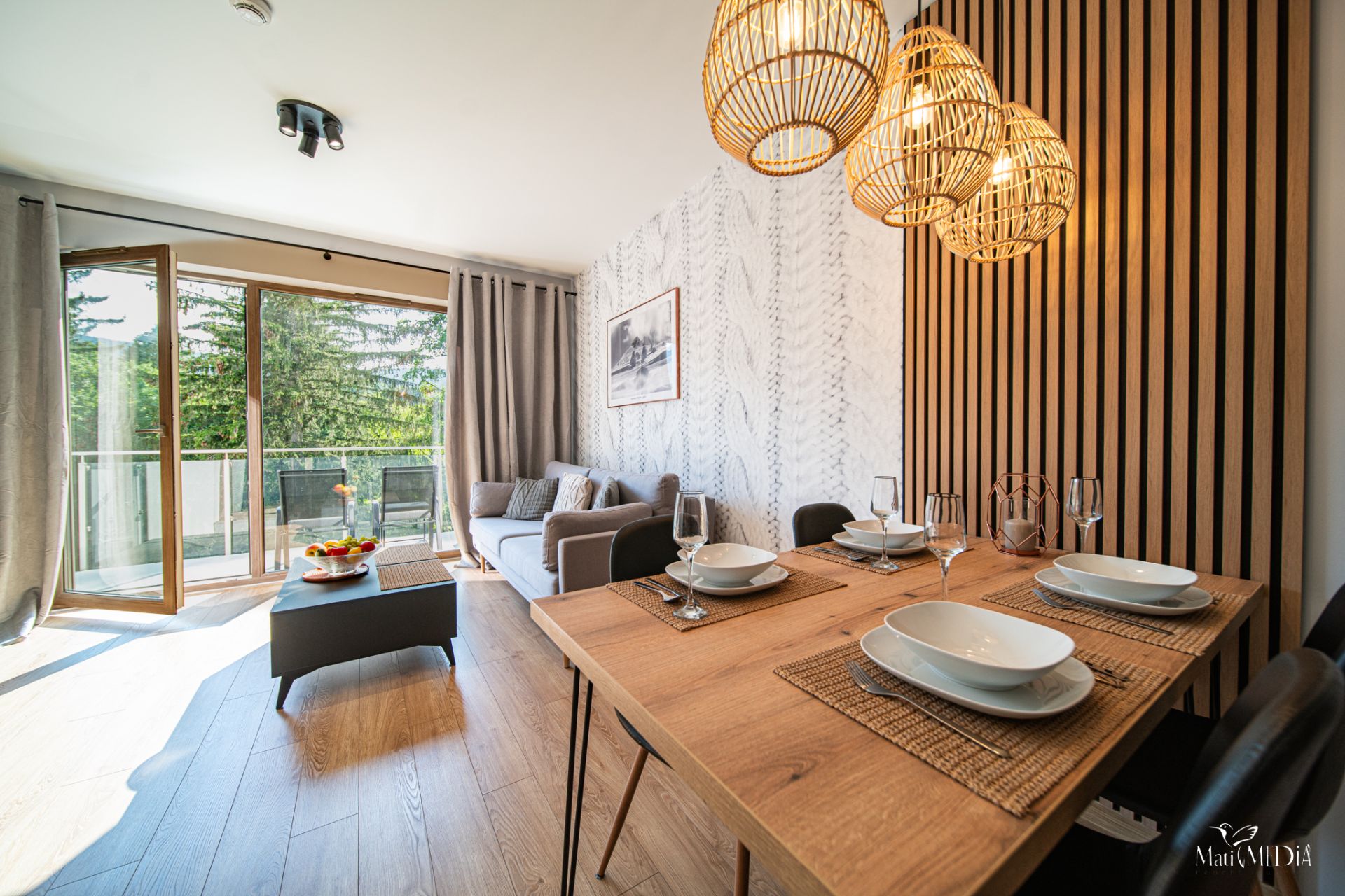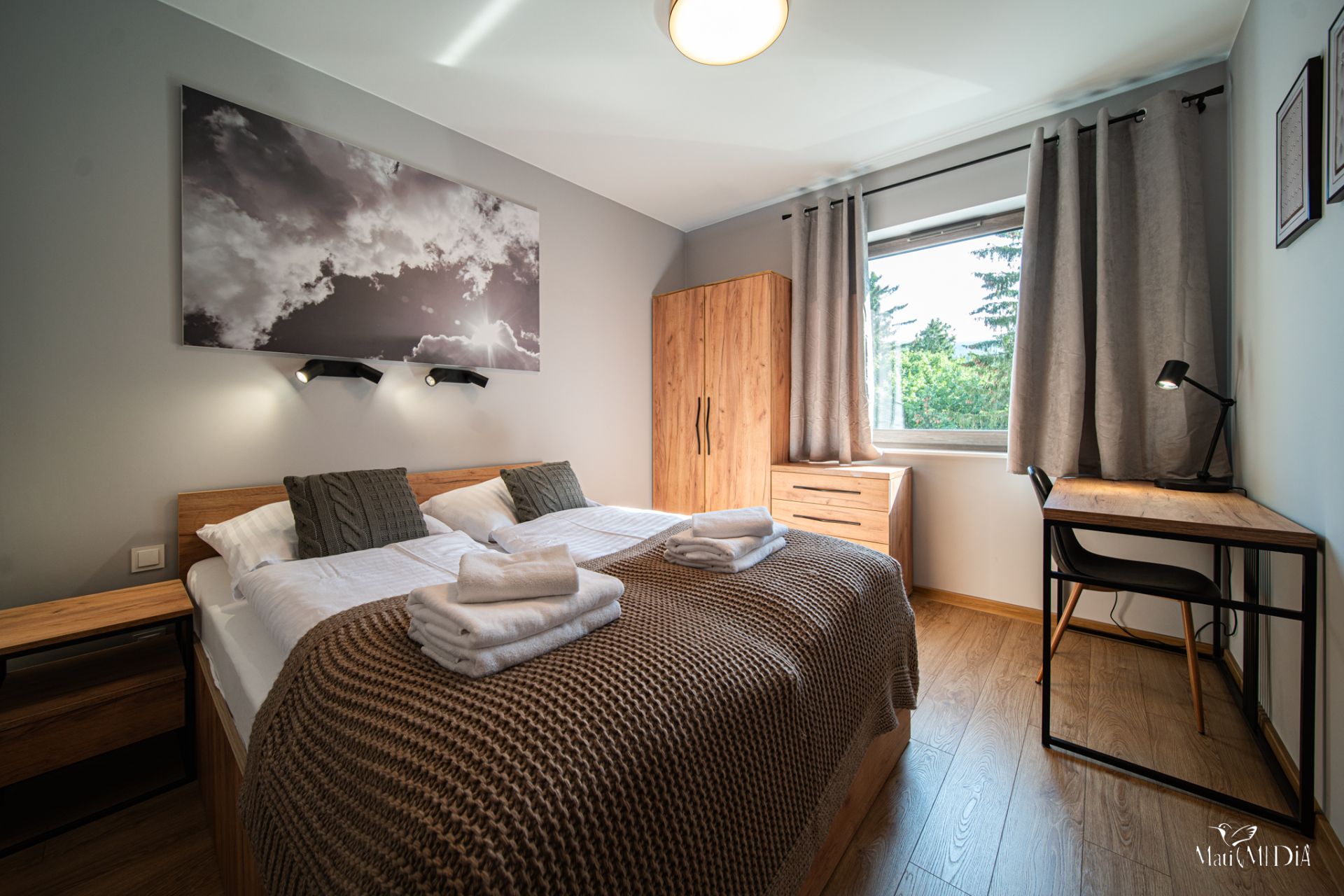Apartament , salon, sypialnia z wygodnym łóżkiem . W pełni wyposażony aneks kuchenny . Parking w cenie pobytu . Apartament ul. Kilińskiego 8 Szklarska Poręba .