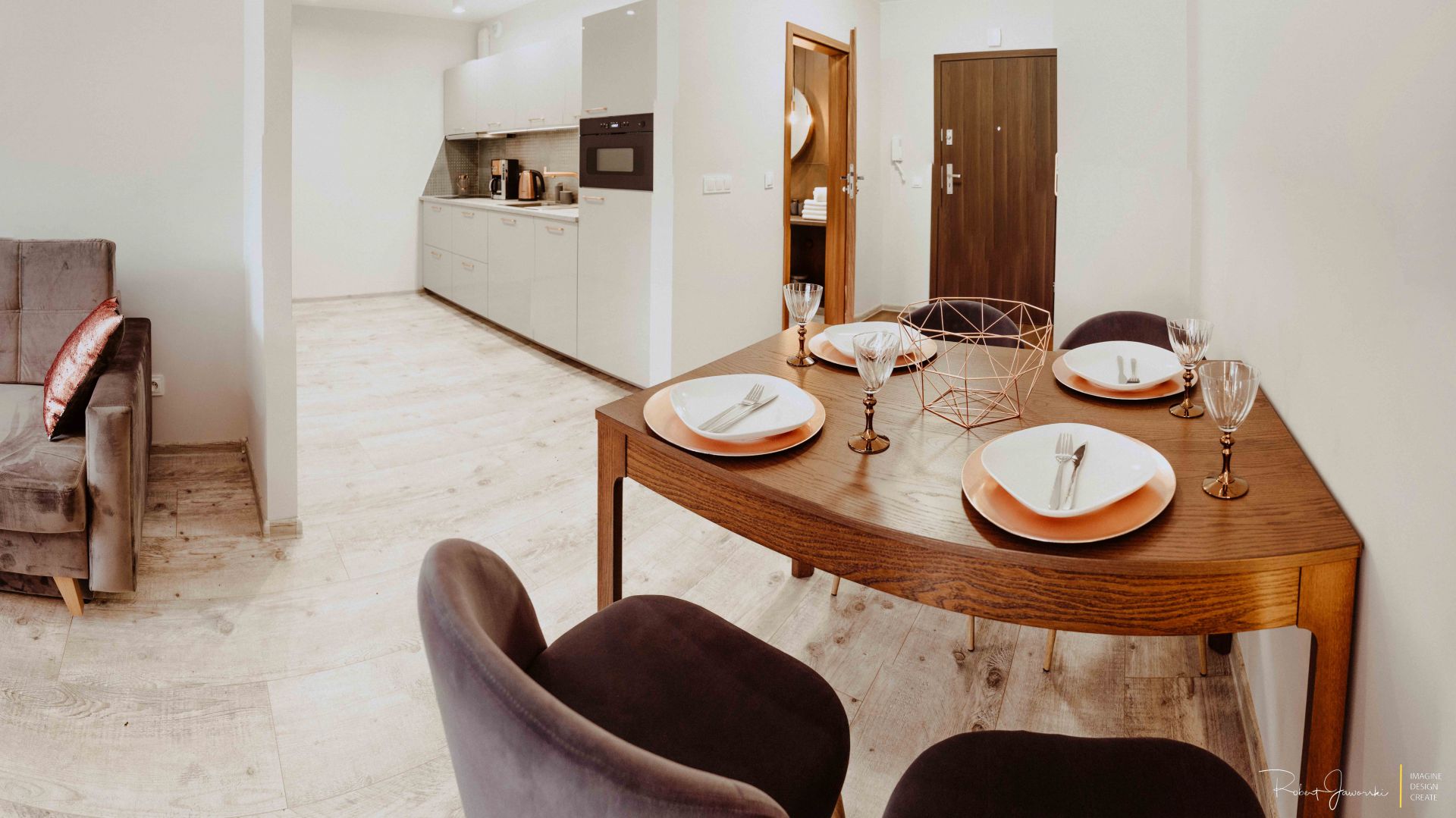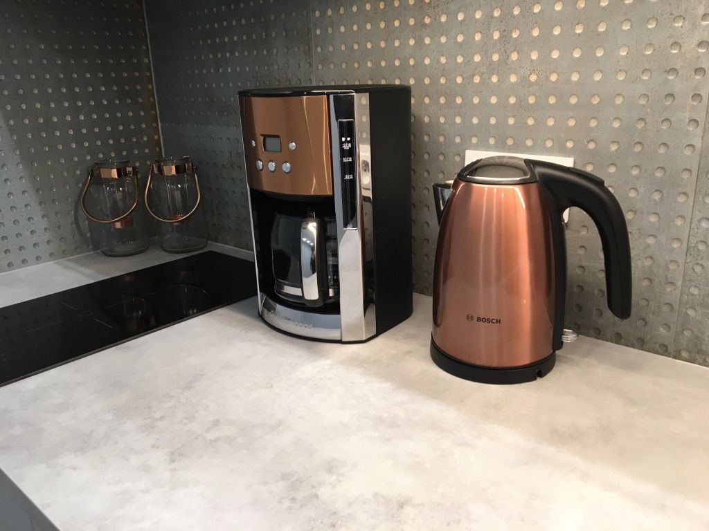 Aneks kuchenny wyposażony : płyta indukcyjna, piekarnik, zmywarka, lodówka, czajnik elektryczny,  naczynia, garnki, sztućce .
