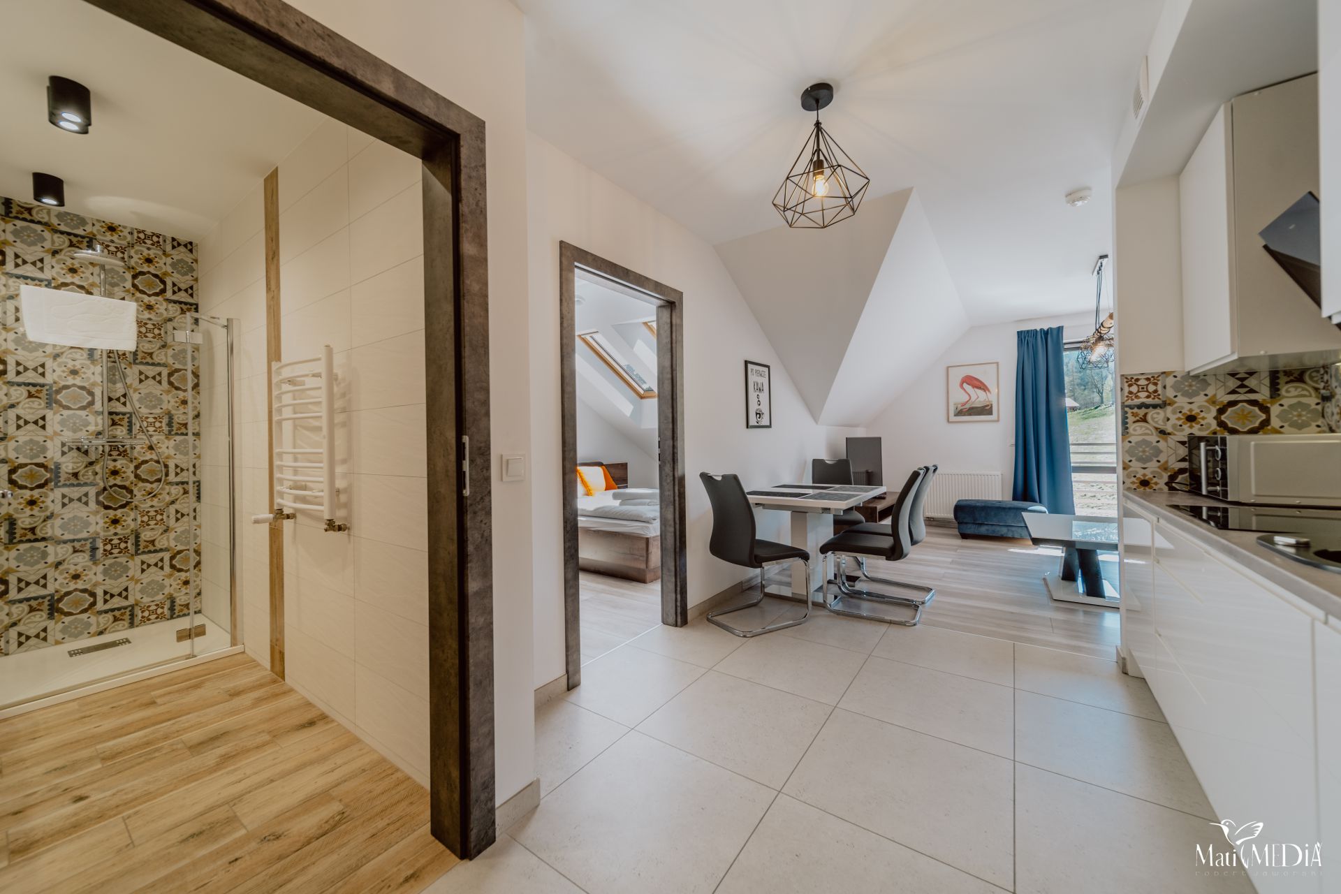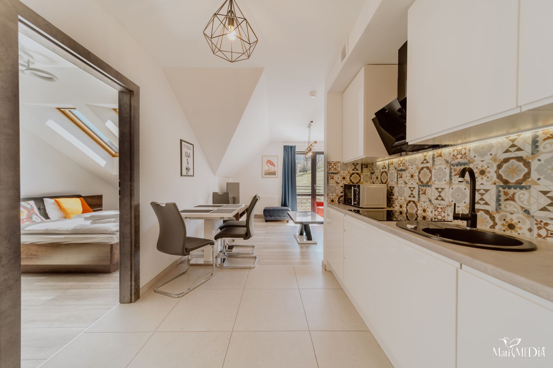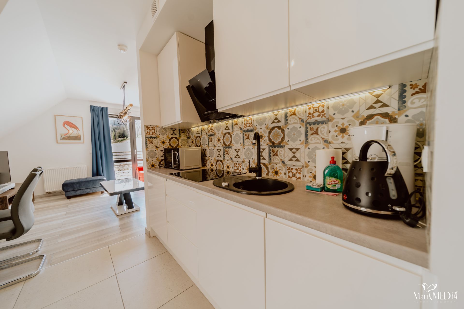 Aneks kuchenny wyposażony : płyta indukcyjna, piekarnik, zmywarka, lodówka, czajnik elektryczny, naczynia, garnki, sztućce .