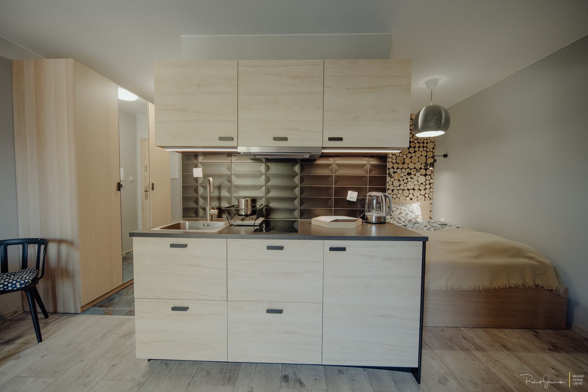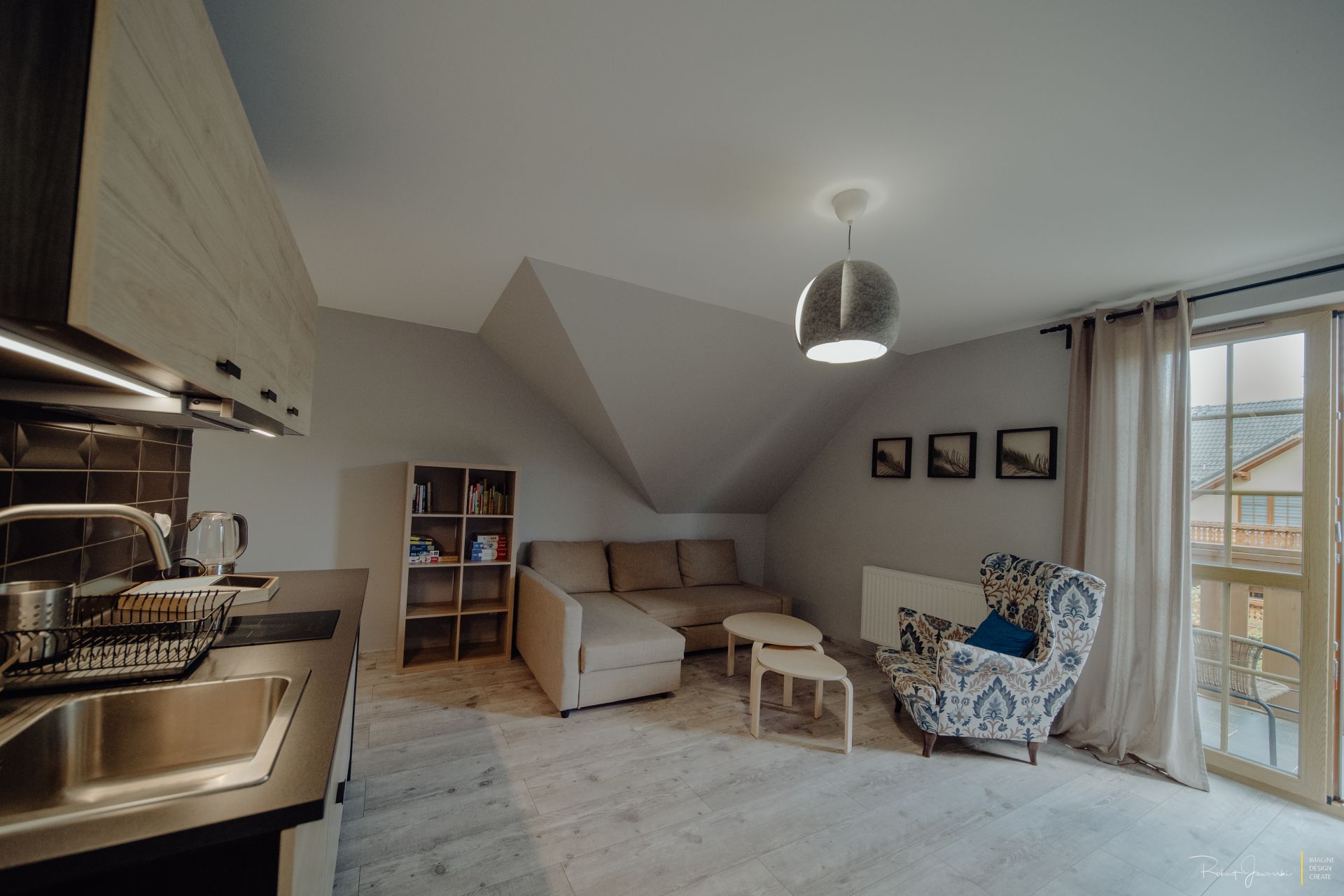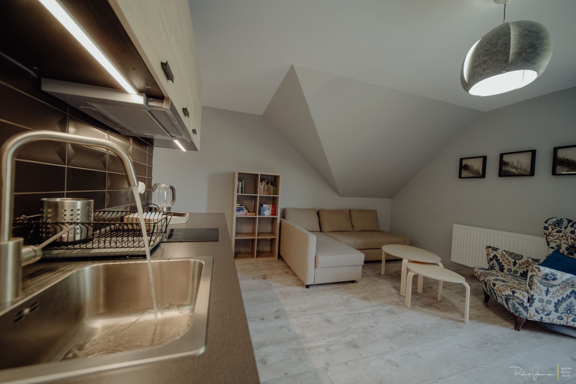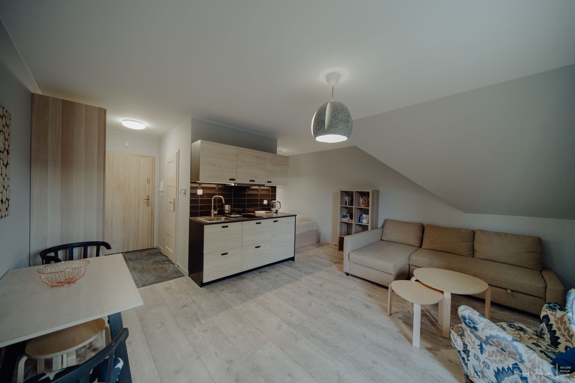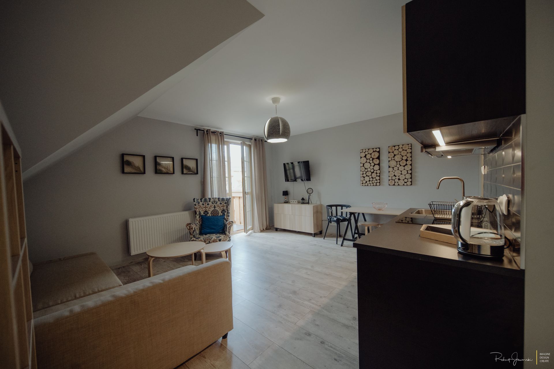 Aneks kuchenny wyposażony : płyta indukcyjna, piekarnik, lodówka, czajnik elektryczny, zmywarka naczynia, garnki, sztućce .
