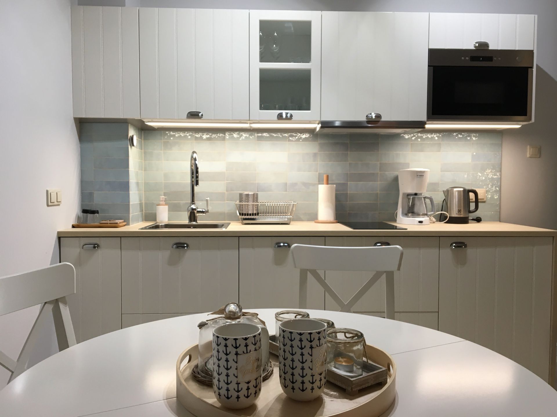 Aneks kuchenny wyposażony : płyta indukcyjna, piekarnik, zmywarka, lodówka, czajnik elektryczny,  naczynia, garnki, sztućce .
