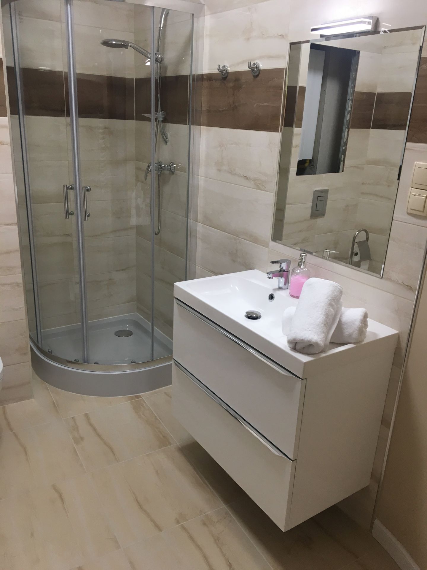Łazienka : toaleta, prysznic, suszarka do włosów,