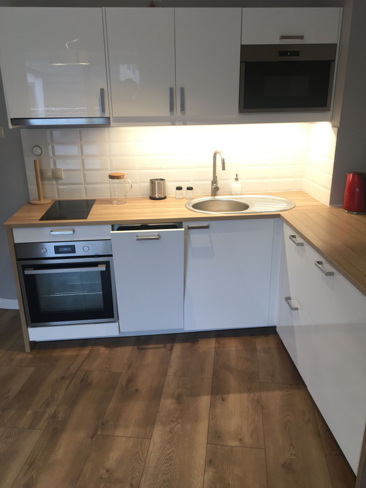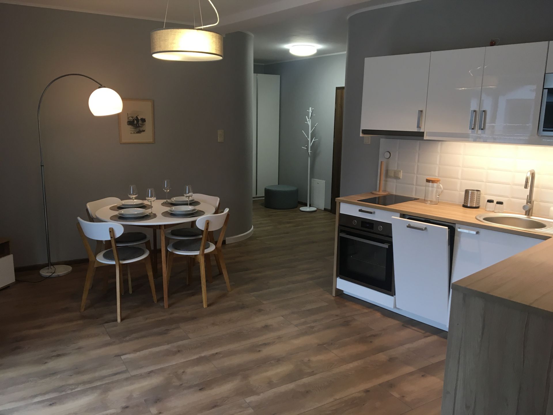 Aneks kuchenny wyposażony : płyta indukcyjna, piekarnik, zmywarka, lodówka, czajnik elektryczny, naczynia, garnki, sztućce .