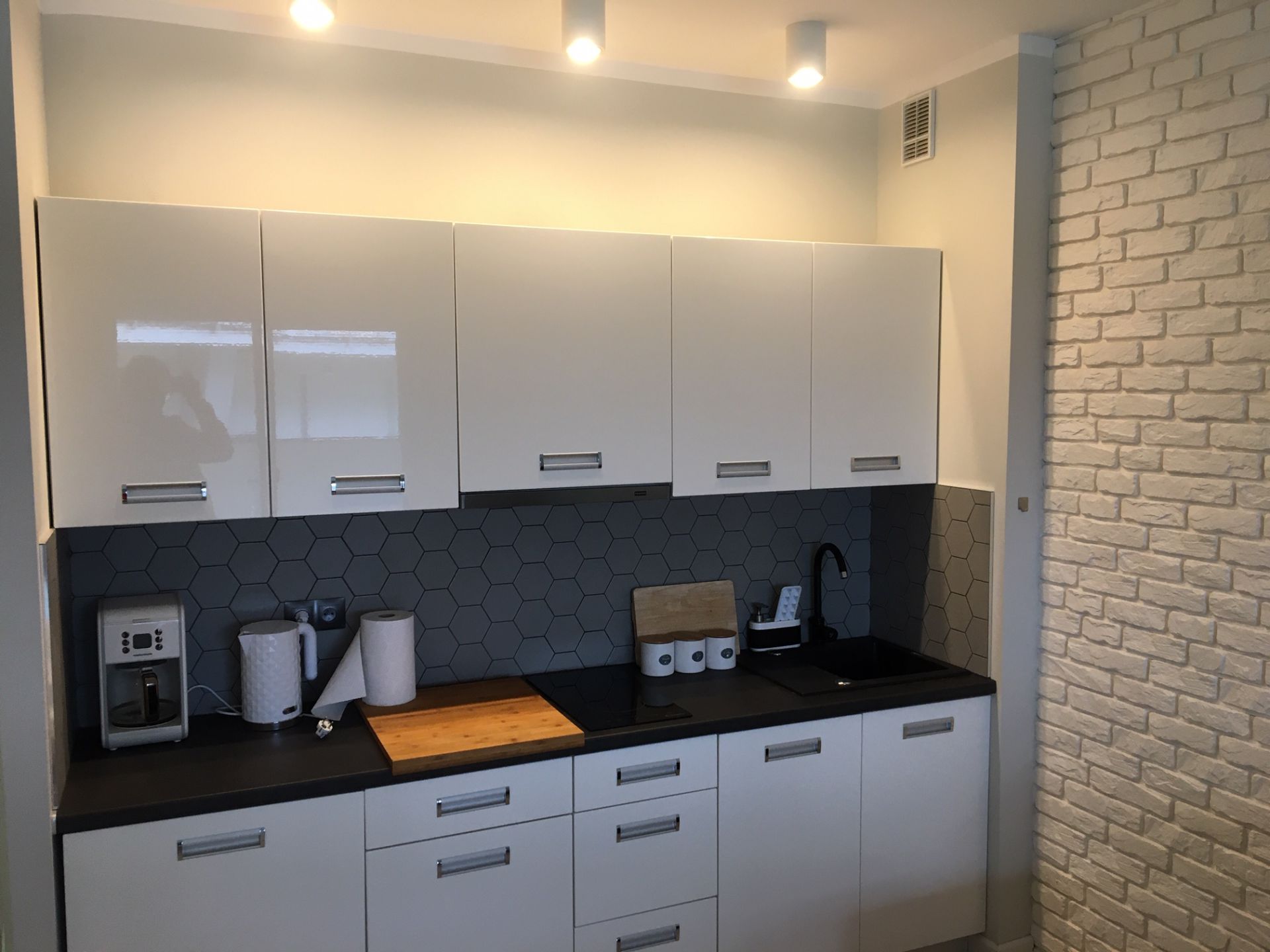 Aneks kuchenny wyposażony : płyta indukcyjna, piekarnik, zmywarka, lodówka, czajnik elektryczny, naczynia, garnki, sztućce .