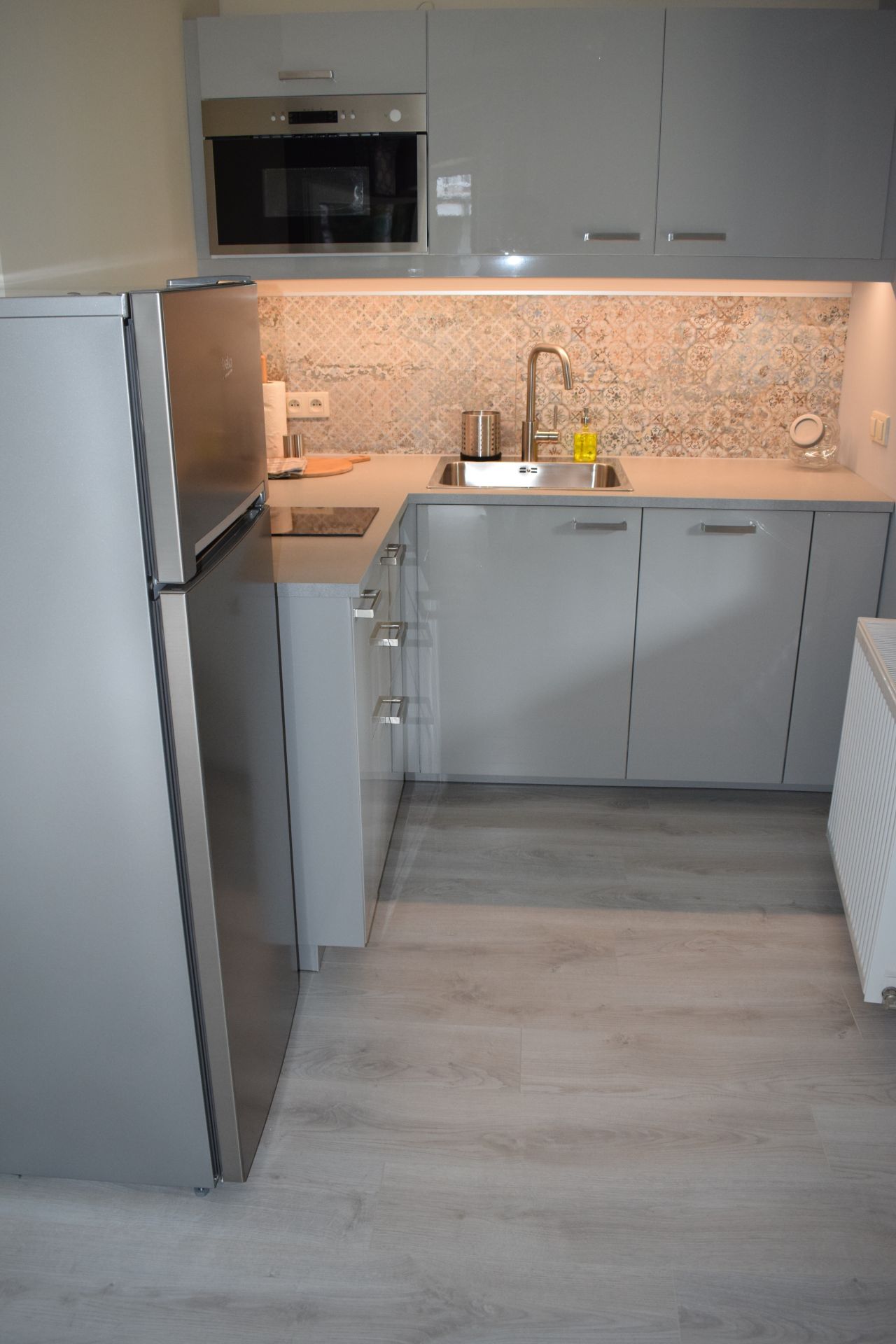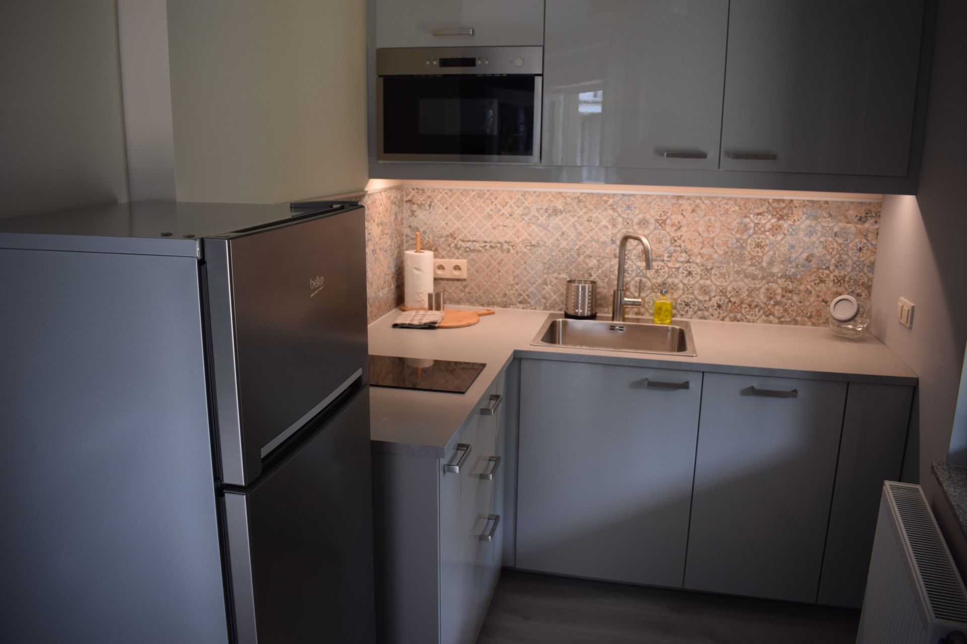 Aneks kuchenny wyposażony : płyta indukcyjna, piekarnik, zmywarka, lodówka, czajnik elektryczny,  naczynia, garnki, sztućce .