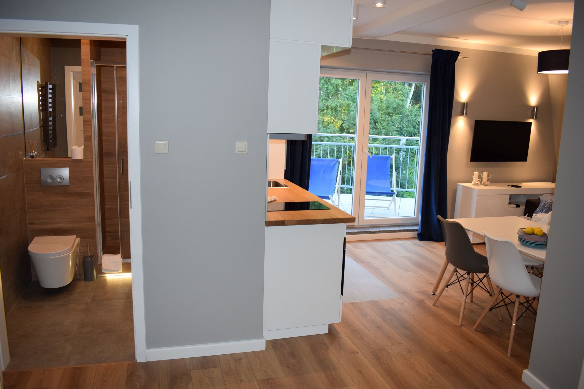Aneks kuchenny wyposażony : płyta indukcyjna, piekarnik, zmywarka, lodówka, czajnik elektryczny, naczynia, garnki, sztućce .